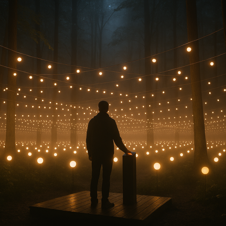 At Listening Forest in Arkansas, Aaron Koblin wires eight woodland clearings so they only wake when a visitor arrives: stand on a platform, let the sensor catch your rhythm, and the treetops strobe at precisely your BPM—as though photosynthesis had learned to keep time. crystalbridges.org